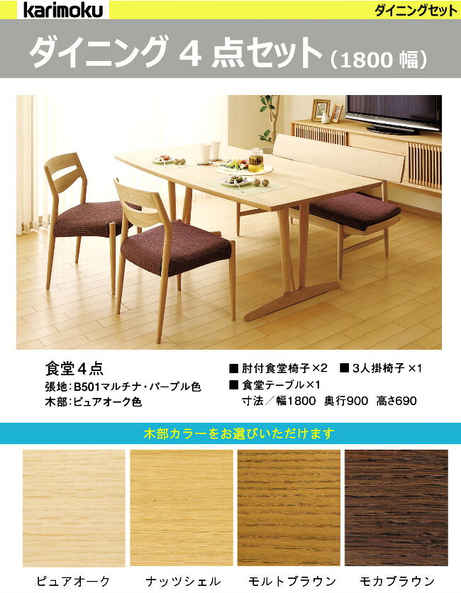 商品仕様 素材・カラー カリモク ダイニング 4点セット 【CU71肘なしチェア×2/U26布張り・ 3人掛椅子/U26布張り・1800無垢テーブル】 オーク材 サイズ テーブルW1800xD900xH690 チェアW555xD560xH765(SH425) 3人掛椅子W1500xD570xH735(SH425) 重量 備考 関連 カリモク ダイニング 4点セット【CU71肘なしチェア×2/U26布張り・3人掛椅子/U26布張り・1800無垢テーブル】食堂椅子 ダイニングチェア ダイニングテーブル karimoku 送料 開梱設置送料無料! 納期 納期約3週間 (在庫が切れている場合、遅れることがあります) お急ぎの方は以下【お問い合わせ】より納期の確認をお願いします。