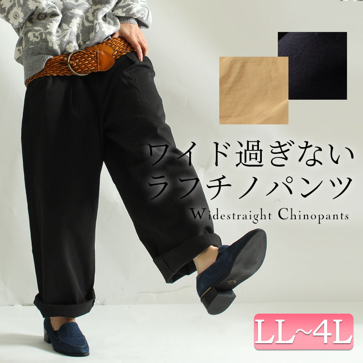 着まわしに1着は持っていたい、カジュアルチノパンツ☆ 大きいサイズ レディース ボトムス パンツ ズボン 長ズボン チノパンツ ワイドパンツ ストレートパンツ ポケット ウエストゴム チノパン LL 2L 3L 4L XL XXL 13号 15号 17号 LLサイズ ブラック 黒 black ベージュ