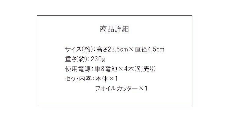 【商品詳細】サイズ(約):高さ23.5×直径4.5cm重さ(約):230g(電池含まず)使用電源:単3電池4本(別売り)セット内容:本体、フォイルカッター、日本語簡易説明書※電池の入れ方が、同封の説明書と異なる場合がございます。