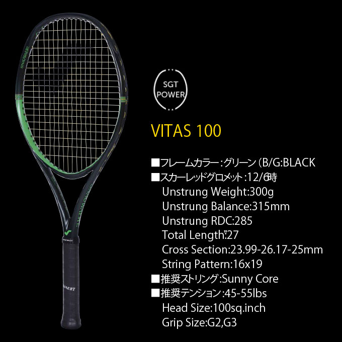 ■フレームカラー:グリーン ( B/G BLACK ) ■スカーレッドグロメット:12/6時 ■Unstrung Weight:300g ■Unstrung Balance:315mm ■Unstrung RDC:285 ■Total Length:27” ■Cross Section:23.99-26.17-25mm ■String Pattern:16×19 ■推奨ストリング:Sunny Core ■推奨テンション:45-55lbs ■Head Size:100sq.inch ■Grip Size:G2、G3 ※ラケットケースは付属しておりません。